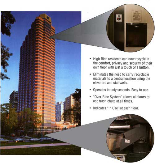 Strict recycling mandates are inevitable. Installation now would not only save you money but would help begin the recycling revolution. The SunClean Chute Fed Recycling System with NuReTec Technology is specifically engineered for effective implementation by mid/high-rise recyclables with a revolutionary system designed for the collection of glass, aluminum, paper, plastic, metal cans, etc.